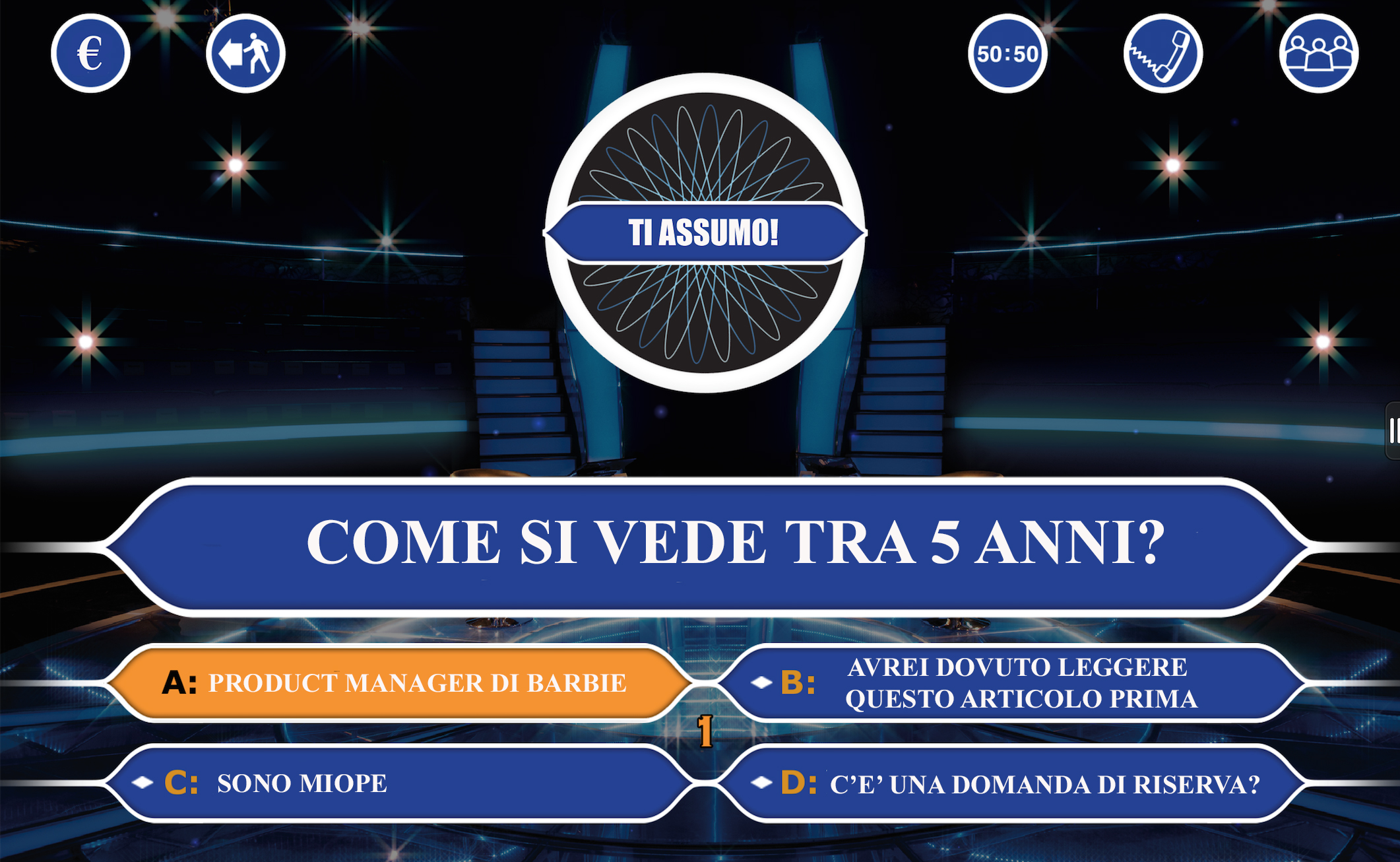 Questi sono solo alcuni dei quesiti più particolari richiesti durante i colloqui di celebri multinazionali e non è fantascienza o un qualcosa che “capita solo in America”. Pochi giorni fa ho sentito telefonicamente un amico e mi ha raccontato che durante un colloquio gli hanno dato carta e penna ed è stato sottoposto a questa domanda: “Secondo lei quante palline da ping pong entrano in questa stanza?”. Domande come questa potrebbero provocare un senso d’ansia o di smarrimento, ma a tutto ciò c’è un perché. Chi pone queste domande desidera analizzare l’elasticità mentale dell’individuo, la sua capacità di problem solving anche in situazioni fuori dal comune e il suo modo di approcciarsi alle sfide. A queste domande non esiste risposta giusta, i selezionatori vogliono solo vedere la nostra reazione a una situazione di stress (al riguardo a breve pubblicherò un articolo ad alta tensione riguardo un nuovo “sport estremo”: la stress interview). La finalità è dunque solo quella di verificare la modalità di ragionamento del candidato, testarne i valori e la determinazione, le capacità logiche e le tecniche di ragionamento. Inoltre, questa procedura è un modo per attuare un confronto tra le risposte degli altri candidati e valutarne la migliore. La cosa importante da tenere a mente è che queste domande, pur essendo una piccola parte di tutto il processo riguardante il colloquio di lavoro, possono rivelarsi utili a stimolare un vostro lato creativo che non sapevate di avere. Se questo articolo vi creato un po’ di tensione, pensate al colloquio di lavoro come se fosse un quiz a premi. E pensatevi come concorrenti particolarmente fortunati perché, oltre a conoscere le domande in anticipo, avete sempre a disposizione i tre famosi aiuti. Qui, però, piuttosto che “aiuto del pubblico”, “telefonata a casa” e “50:50”, ci sono la preparazione, la motivazione e un pizzico di fortuna che non guasta mai. Il premio del “Chi vuol essere assunto”, tuttavia, vale più del famoso milione, esso è un solido mattoncino per iniziare a costruire le basi del proprio futuro e per iniziare a farsi strada nel mondo del lavoro.”